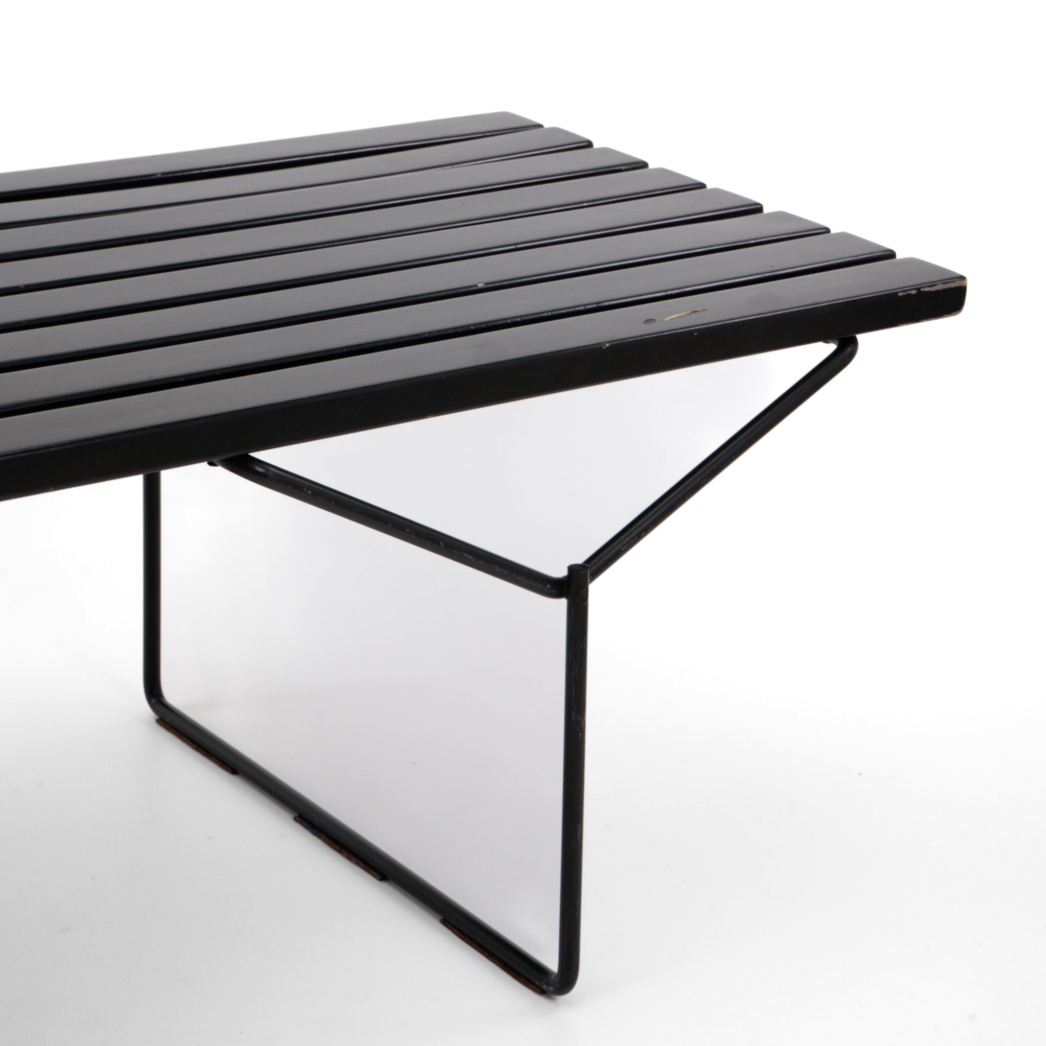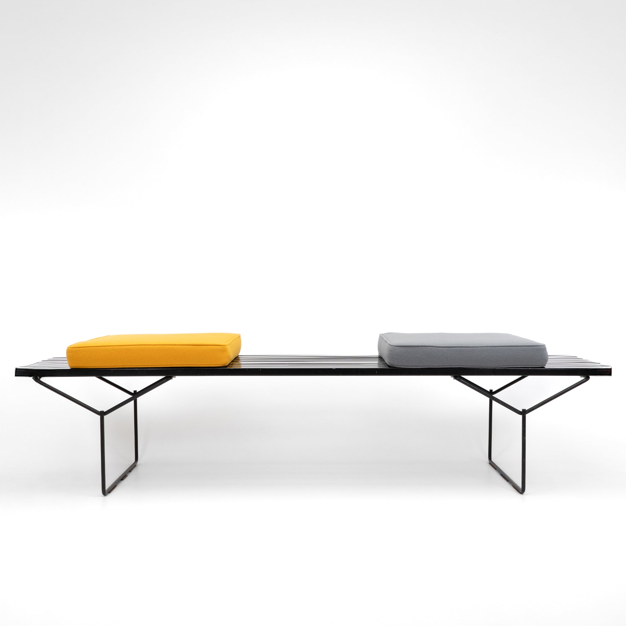 Die Bertoia Lattenbank von Knoll International ist ein minimalistischer Designklassiker mit skulpturaler Klarheit. Entworfen von Harry Bertoia, verbindet sie eine schlanke, horizontale Holzlattung mit einem leichten, geometrischen Stahlrahmen. Ob als Sitzbank, Ablage oder Solitärmöbel – dieses Original überzeugt durch seine zeitlose Formsprache und vielseitige Einsetzbarkeit im Wohn- oder Objektbereich.